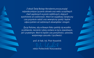 Najserdeczniejsze życzenia z okazji Świąt Bożego Narodzenia składa rektor Politechniki Rzeszowskiej prof. dr hab. inż. Piotr Koszelnik.