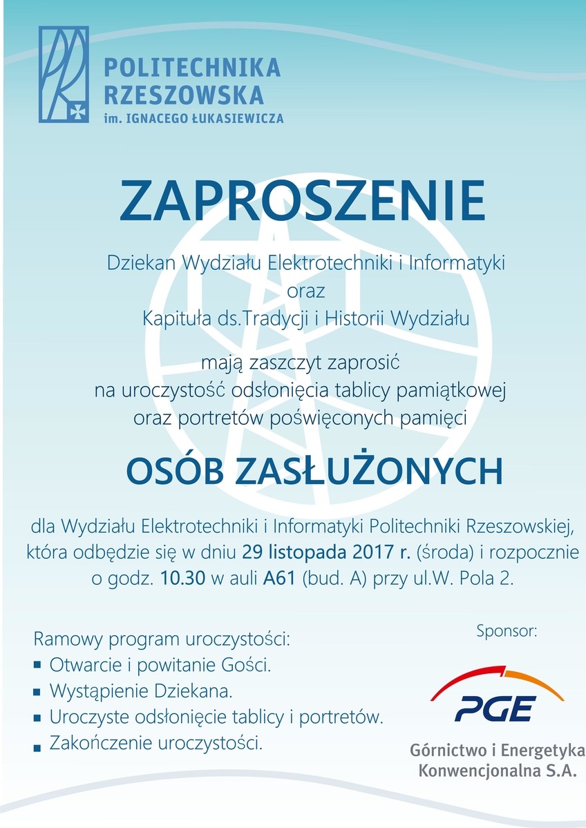 Uroczystość upamiętniająca wybitne i zasłużone osoby dla Wydziału Elektrotechniki i Informatyki Politechniki Rzeszowskiej odbędzie się 29 listopada w sali A-61 (bud. A o godz. 10.30).