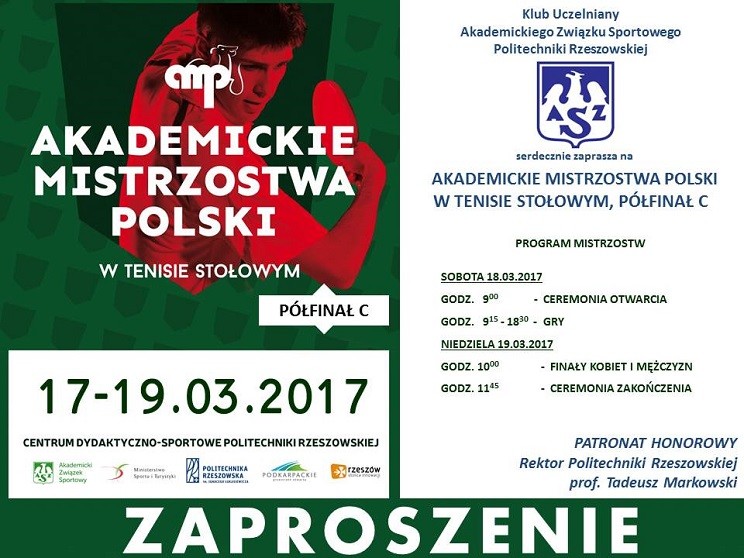 Od 17 do 19 marca br. potrwają zorganizowane przez Klub Uczelniany AZS Politechniki Rzeszowskiej strefowe eliminacje drużynowe Akademickich Mistrzostw Polski w Tenisie Stołowym Kobiet i Mężczyzn (półfinał AMP).